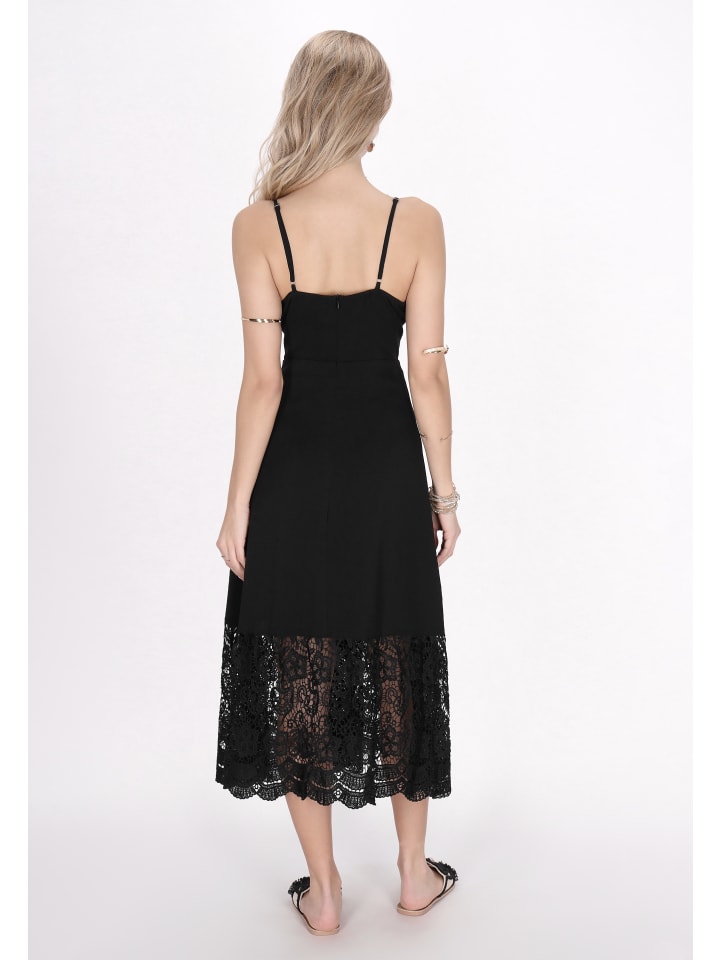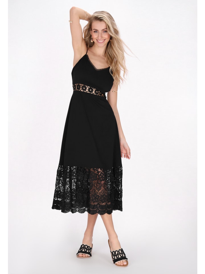 This fashionable midi dress was designed with fashion lovers in mind. It has a regular cut, a fitted V-neckline and delicate shoulder straps to enhance your look. Lace floral inserts and decorative neckline trims add elegance, while the woven fabric provides comfort and breathability - perfect for a spring-summer collection!