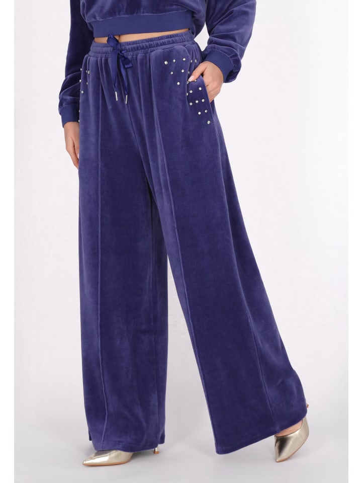 Discover style with these loose-fitting wide-leg pants from our Fashion Look collection. They feature long legs, an elastic waistband and a drawstring for the perfect fit. Embellished with rhinestones and made of plush velvet, these simple yet stylish pants offer pockets for convenience, making them ideal for everyday fashion.