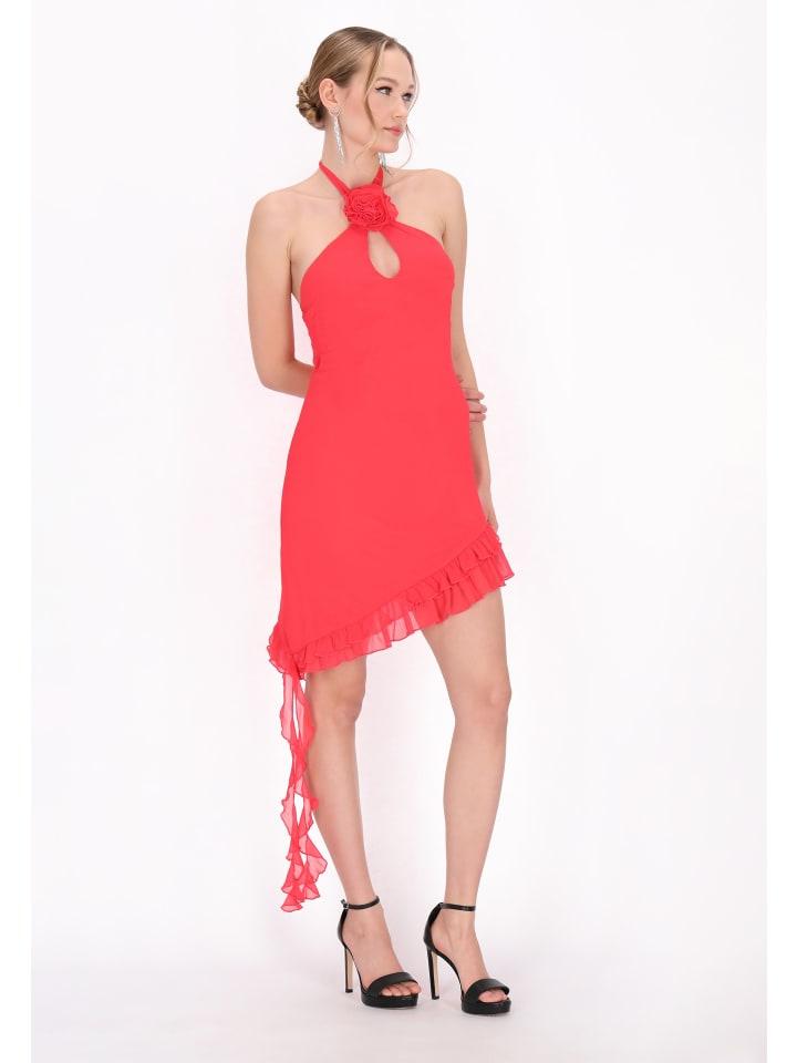 Discover an elegant and fashionable asymmetrical slim fit dress. This sleeveless dress features a keyhole neckline and floral embellishments that add a romantic touch. The ruffled hem adds a playful touch to youthful looks. Perfect for creating an evening look thanks to its airy silhouette and stylish details. It is part of the Spring Summer Collection.