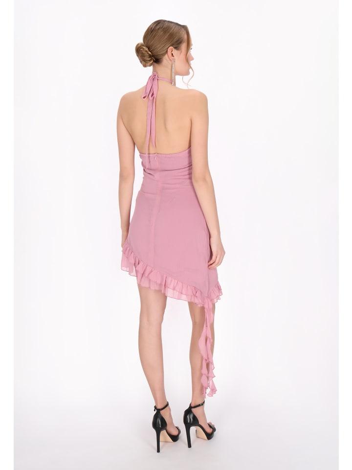 Discover an elegant and fashionable asymmetrical slim fit dress. This sleeveless dress features a keyhole neckline and floral embellishments that add a romantic touch. The ruffled hem adds a playful touch to youthful looks. Perfect for creating an evening look thanks to its airy silhouette and stylish details. It is part of the Spring Summer Collection.