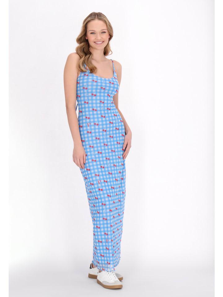 Introducing a maxi dress with a fitted cut and adjustable straps. This sleeveless dress has a round neckline and lace-up details at the back, exuding a fashionable vibe. The hem of the dress and the cherry and checkered pattern, adds a playful touch to the overall look. This dress is perfect for fashion lovers looking for a combination of casual and chic style. It is part of the Spring Summer Collection.
