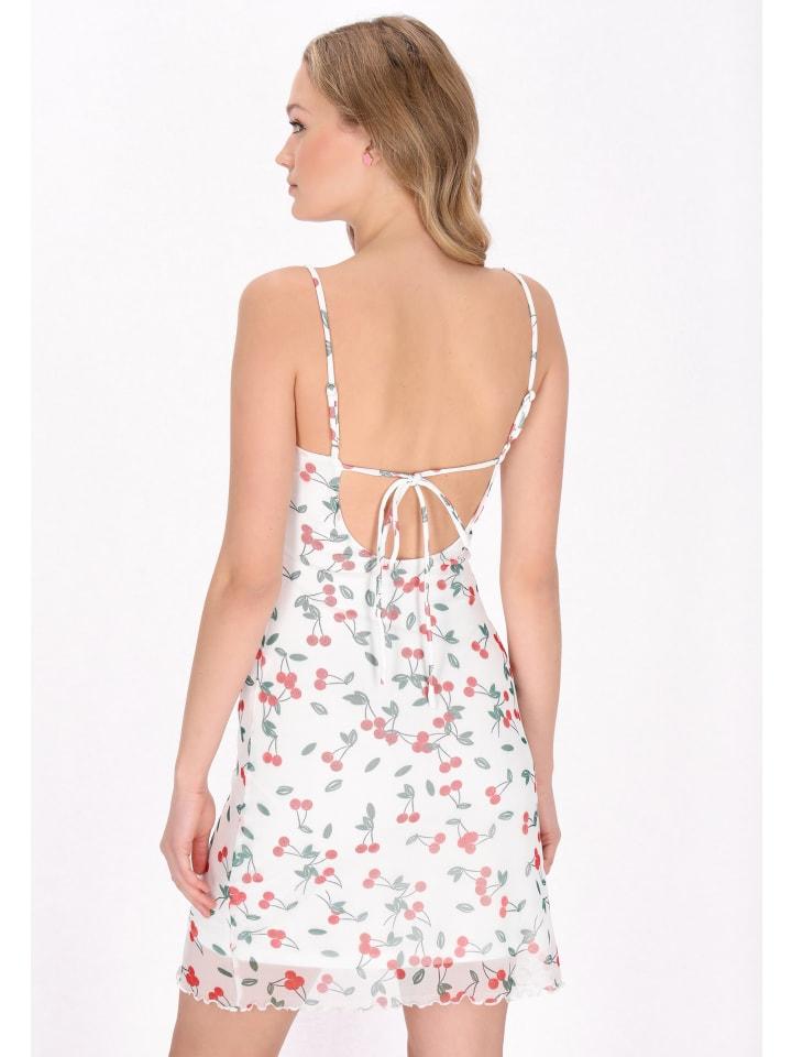 This mini dress has a fitted cut with a round neckline and adjustable straps for a comfortable fit. It features a sleeveless design, a self-tie detail at the back and is lined for added elegance. The hemline adds a playful touch, while the cherry print exudes a youthful fashion. This dress is perfect for summer outings. It is part of the Spring Summer Collection.
