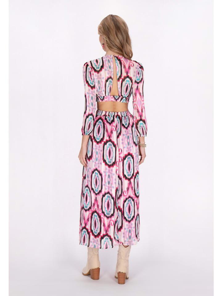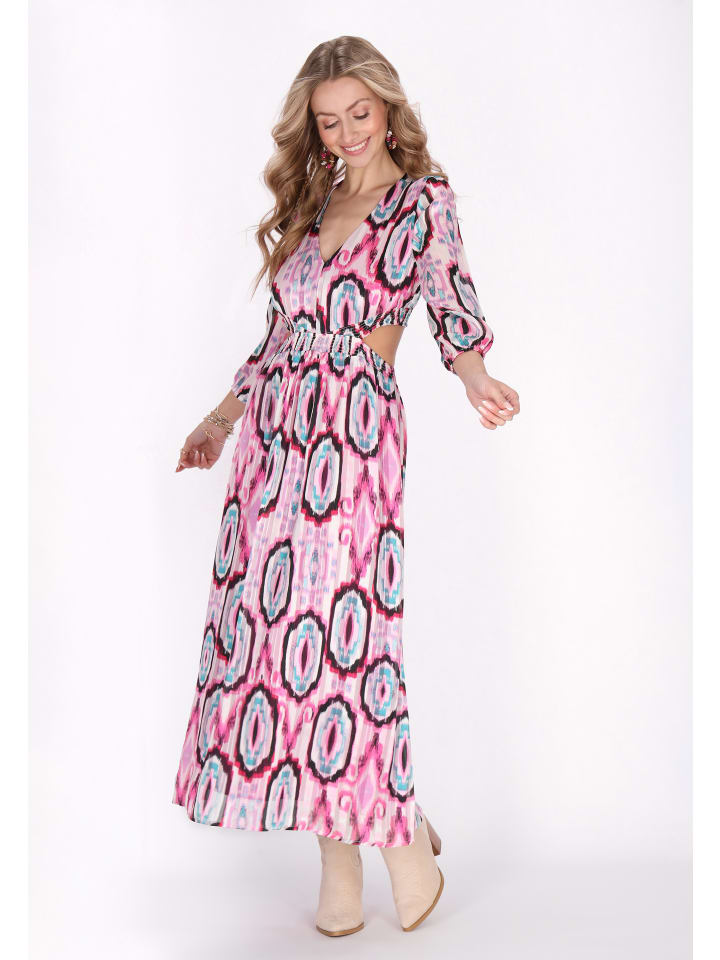 Step up your style game with this stunning long dress featuring a deep V-neckline and 3/4 sleeves. The fitted bodice is cinched with an elastic waistband for a flattering silhouette. Side cutouts add a feminine touch. Crafted from lightweight chiffon with metallic thread, it features a retro pattern that embodies effortless boho charm—perfect for festival wear. Part of the Boho Collection.