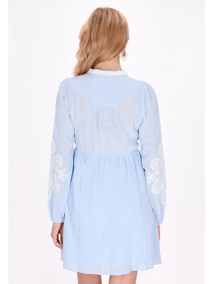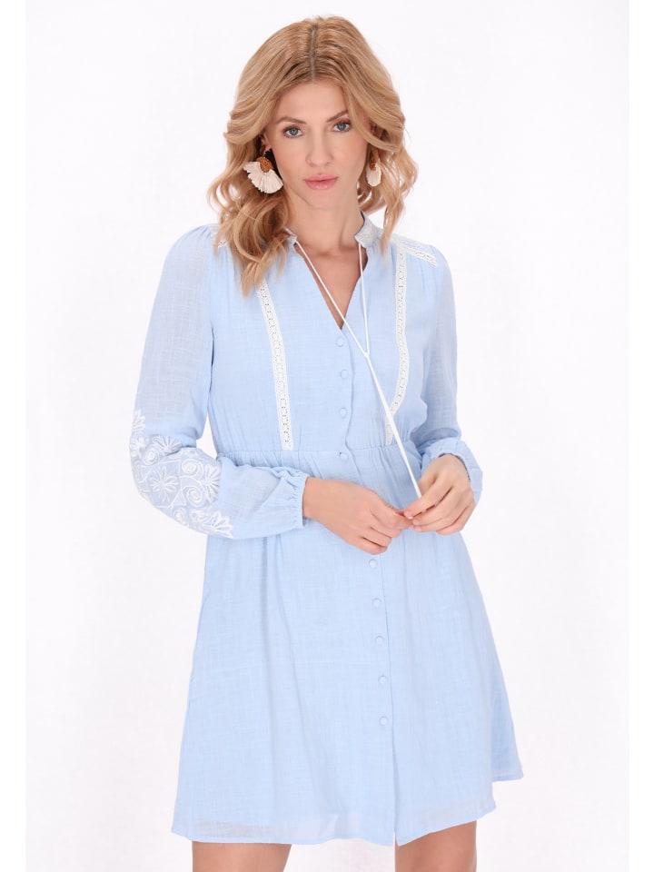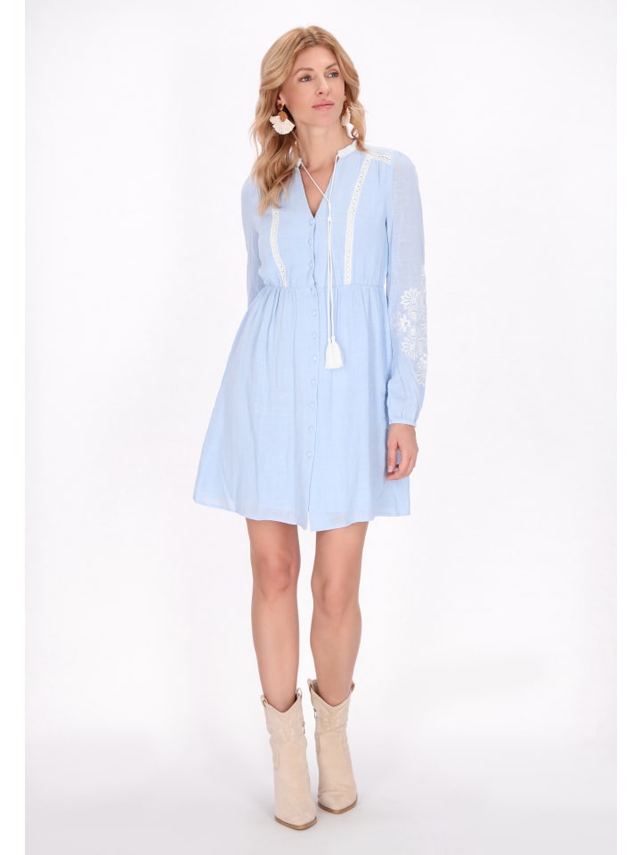 Discover this stylish mini dress in a regular fit, with long sleeves and a V-neckline adorned with fringed cords. The dress showcases embroidery on the sleeves, a button fastening and an elasticated waist for comfort. The woven fabric with a lace band highlights a charming folkloric design, perfect for a spring/summer boho collection.