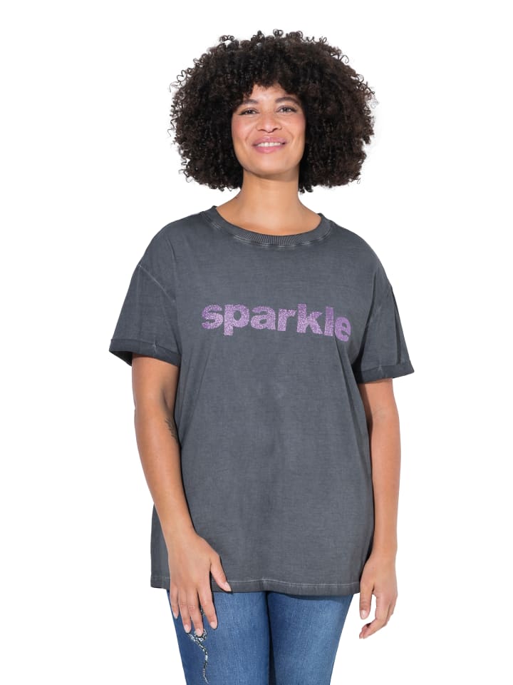 Футболка с квадратной посадкой, сшитая из джерси холодного покроя с надписью с блестками Sparkle. Круглый вырез, плечи внахлест, полурукавки.материал