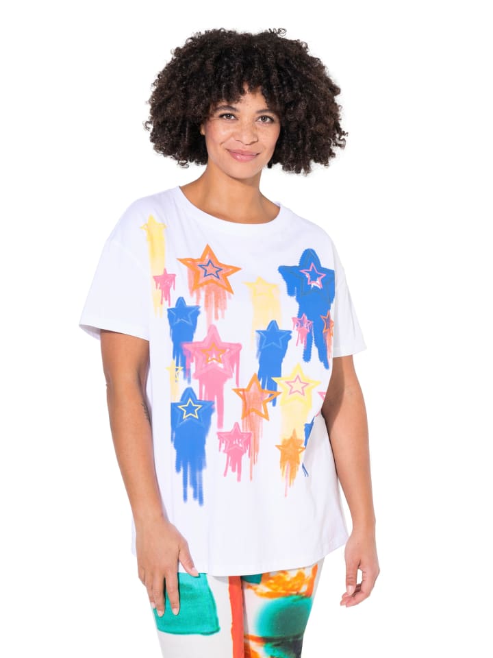 Футболка квадратной формы из мягкого трикотажа со звездным принтом. Круглый вырез, плечи внахлест, полурукавки.материал