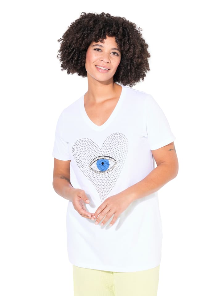 Футболка, удобного кроя, с рисунком в виде глаз и декоративными камнями. V-образный вырез, полурукав.материал