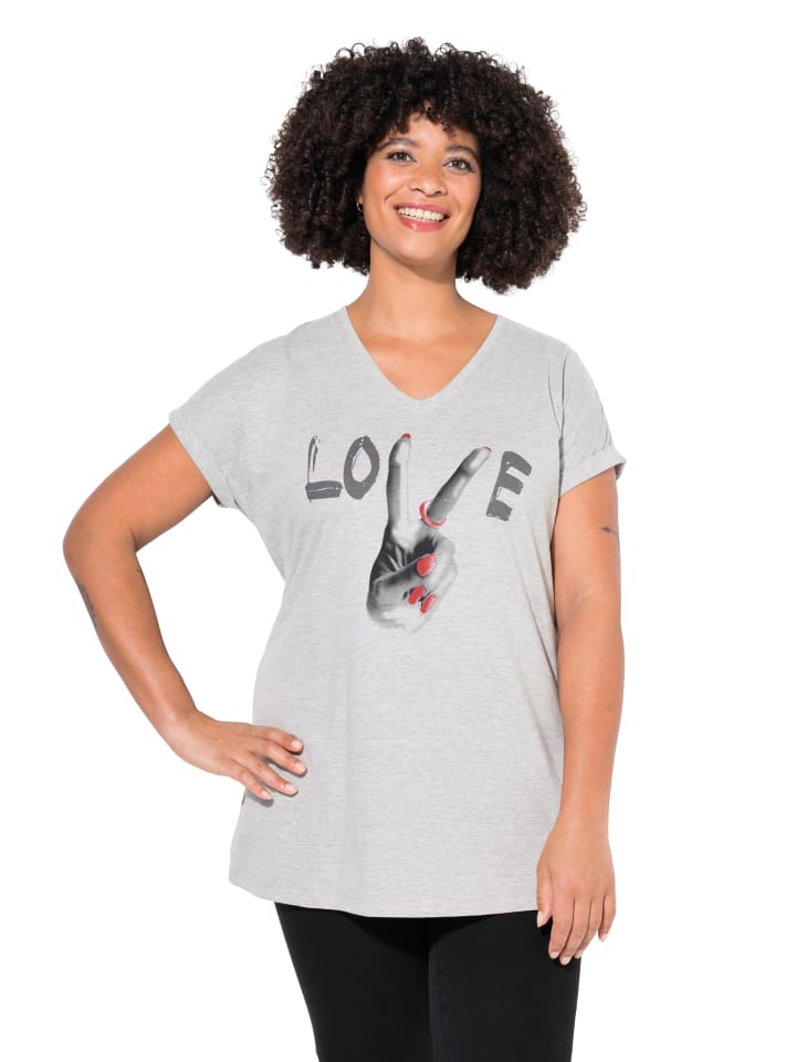 Футболка, удобная, из меланжевого трикотажа с любовным мотивом. V-образный вырез, плечи внахлест, полурукавки.материал