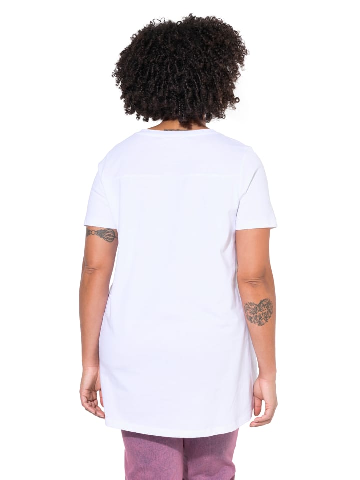 Футболка А-силуэта из мягкого трикотажа с декоративными заклепками на надписи. V-образный вырез, полурукав. Подол сзади длиннее.материал