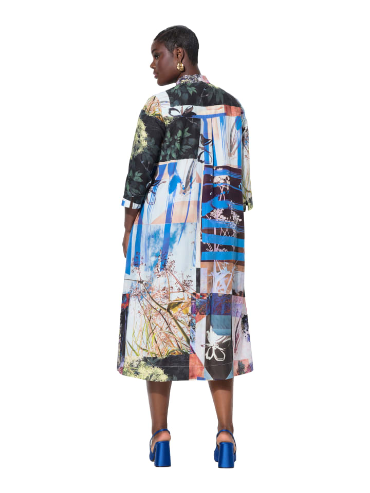Платье-миди из лиоцелла А-силуэта из натурального мягкого лиоцелла с инновационным дизайном в виде патч-принта. Воротник-стойка с V-образным вырезом и декоративной складкой. Рукава 3/4 с разрезом.материал
