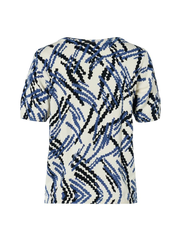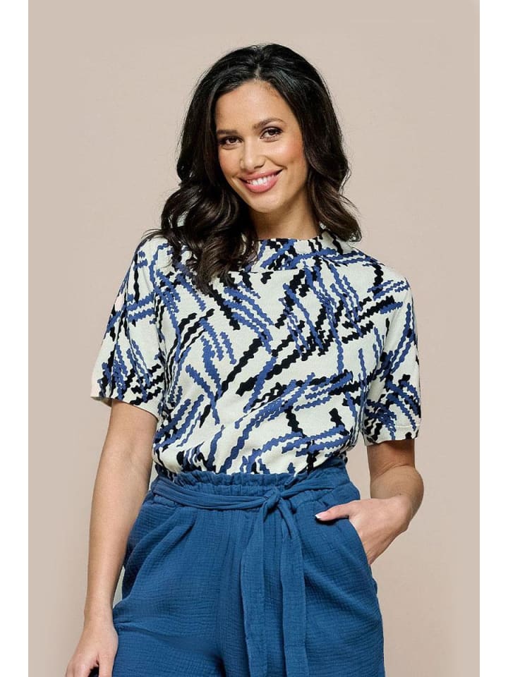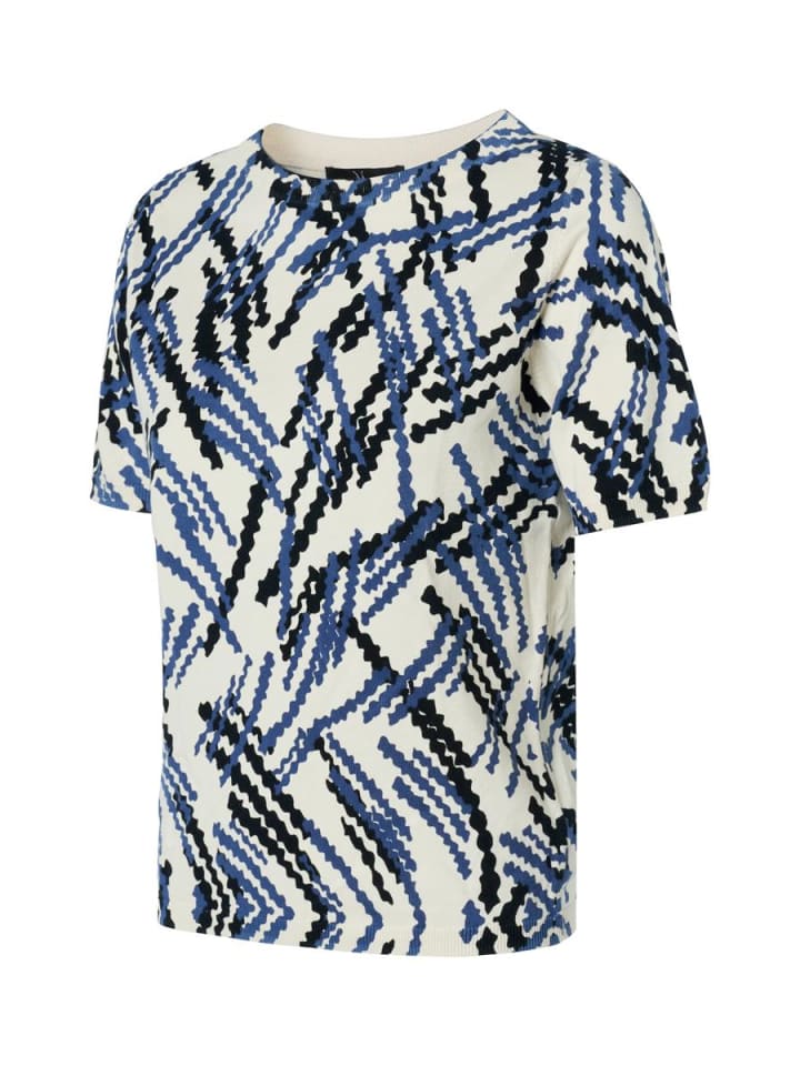 Откройте для себя топ с принтом Mylah, изысканный дизайн которого без особых усилий сочетает в себе стиль и комфорт. Этот мягкий женский вязаный топ с короткими рукавами и вневременным графическим принтом джинсового синего, черного и кремово-белого цветов станет незаменимым элементом вашего гардероба. Женский топ Mylah с широким круглым вырезом, ребристыми краями и прямой посадкой выглядит стильно. Изготовленный из 100% органического хлопка, этот топ не только обеспечивает высокий комфорт при ношении, но и прекрасно ощущается на коже. Носите женский топ модно или повседневно, топ идеально сочетается с белыми джинсами или сочетается с пиджаком и брюками, создавая стильный деловой образ. Этот высококачественный трикотаж из органической хлопковой пряжи является экологически чистым дополнением к коллекции Mart Visser.материал