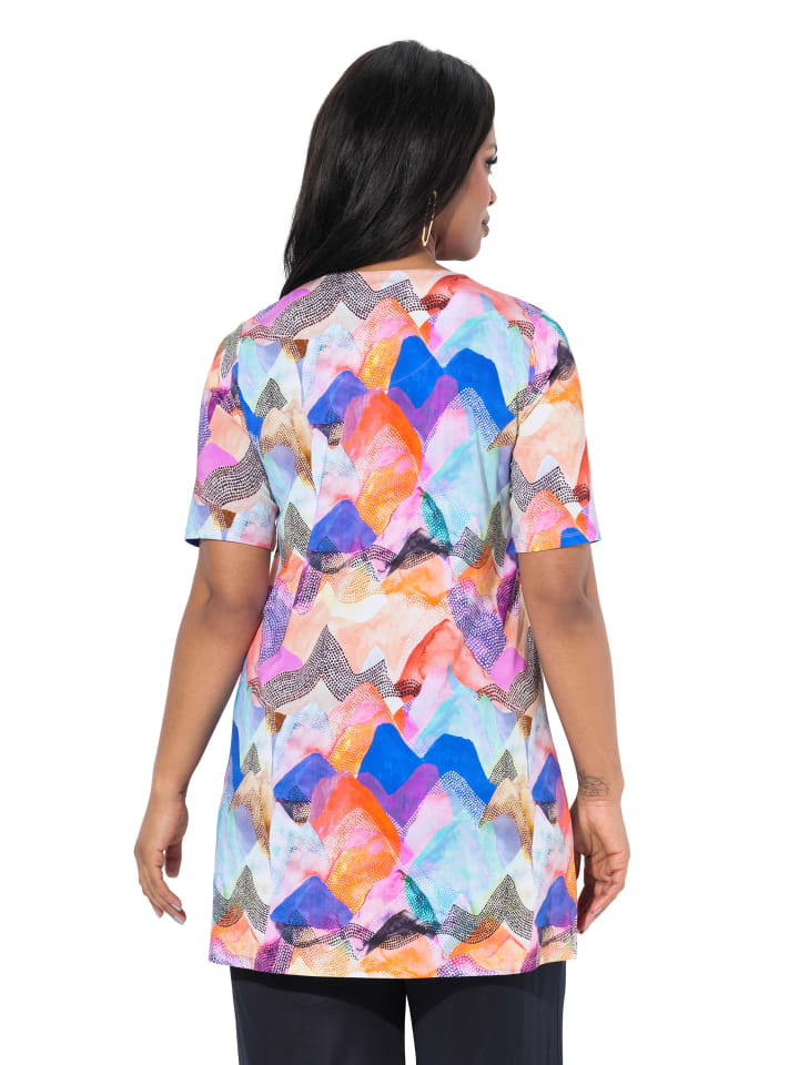 Облегающая длинная рубашка, удлиненная А-силуэта, с абстрактным цветовым оформлением. Круглый вырез, полурукав.материалы