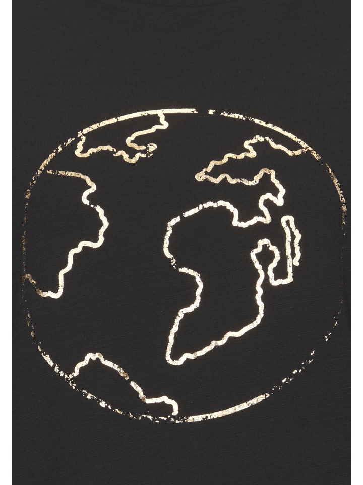 Модная футболка с круглым вырезом от Vivance с блестящим принтом из фольги спереди. Для более непринужденной посадки: резинка на поясе. Трикотаж с легкой текстурой из пламенной пряжи.
