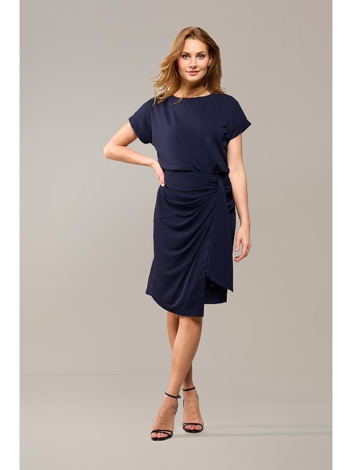 Темно-синяя юбка Райли от Mart Visser - это идеальное сочетание повседневного и спортивного, но в то же время элегантного образа. Юбка приятной длины, заканчивающаяся чуть выше колена, изготовлена из высококачественной трикотажной ткани, обеспечивающей максимальный комфорт при ношении. Легкая эластичность ткани гарантирует, что юбка будет плавно облегать ваше тело, что сделает ее вашей любимой юбкой. Темно-синяя юбка с запахом имеет асимметричный бант на левой стороне, что создает особый эффект. Прямая модель имеет эластичный пояс сзади для идеальной посадки и удобного ношения. Юбка Райли подчеркивает как удобство ношения, так и стиль. Соедините темно-синюю юбку с подходящим топом на бретельках, чтобы создать элегантный образ платья, и дополните образ красивым блейзером и черными ботинками. Выбирайте удобный, но шикарный образ!материалы