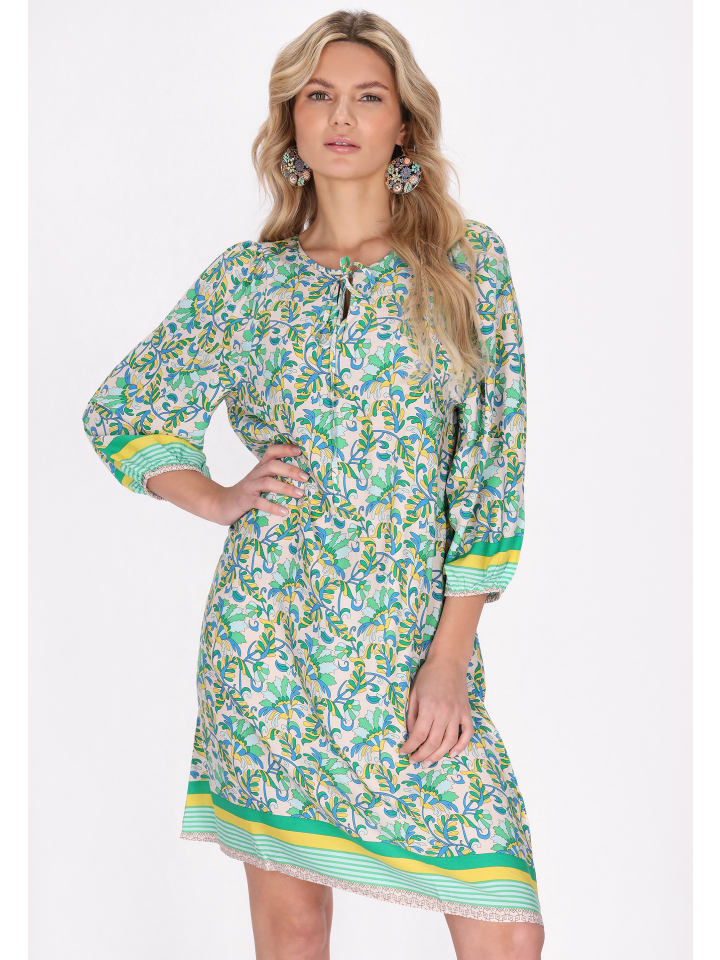 Discover a stunning tunic mini dress from our Boho Fashion Collection. This regular fit design showcases 7/8 sleeves with elastic tape detailing at the cuffs. Featuring a tied up closure at the front, it flaunts a delightful boho print that captures a festival look. Ideal for summer, this dress offers a relaxed vibe with its flowing silhouette and lovely floral accents.
