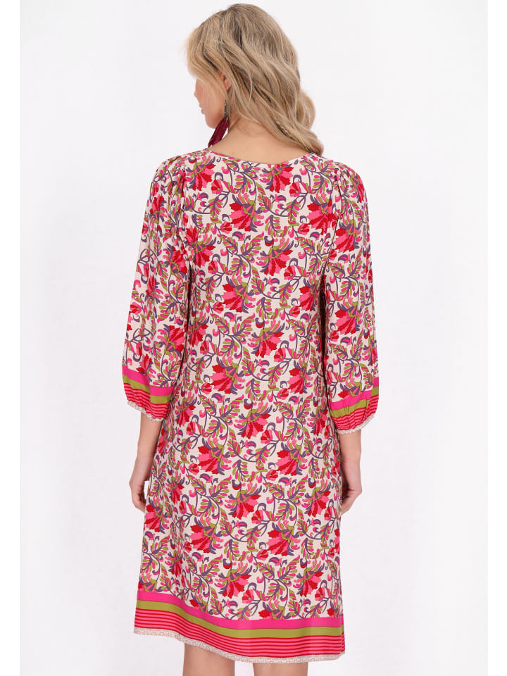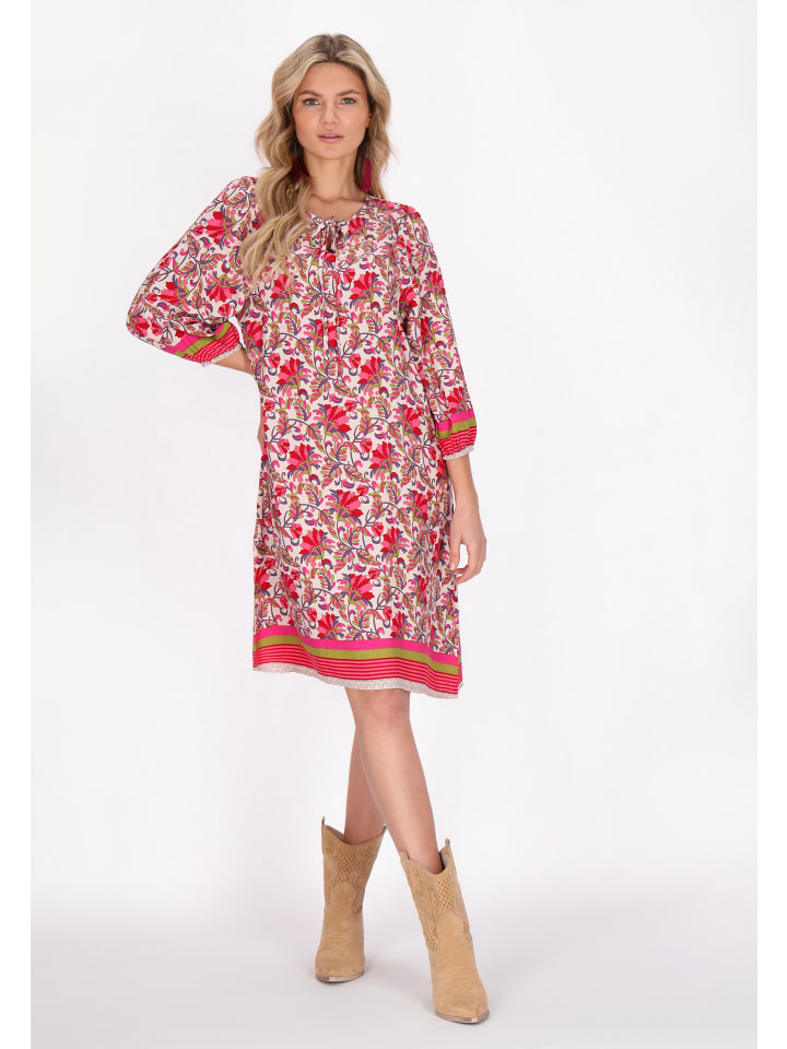 Discover a stunning tunic mini dress from our Boho Fashion Collection. This regular fit design showcases 7/8 sleeves with elastic tape detailing at the cuffs. Featuring a tied up closure at the front, it flaunts a delightful boho print that captures a festival look. Ideal for summer, this dress offers a relaxed vibe with its flowing silhouette and lovely floral accents.