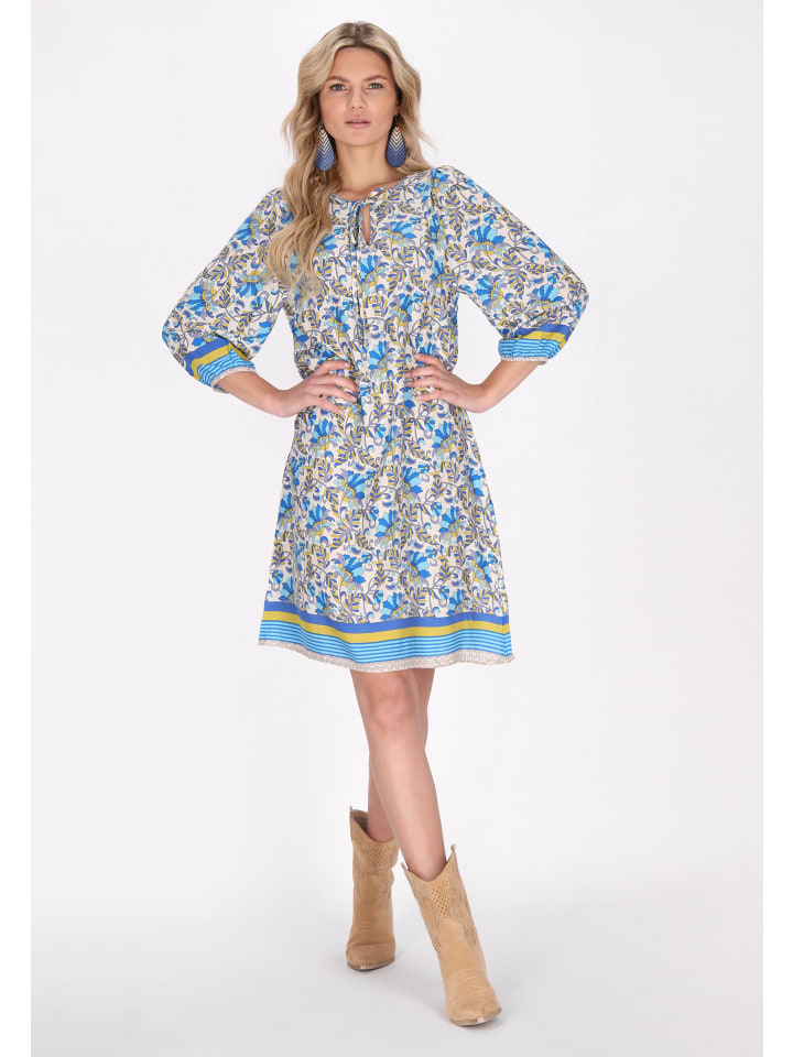 Discover a stunning tunic mini dress from our Boho Fashion Collection. This regular fit design showcases 7/8 sleeves with elastic tape detailing at the cuffs. Featuring a tied up closure at the front, it flaunts a delightful boho print that captures a festival look. Ideal for summer, this dress offers a relaxed vibe with its flowing silhouette and lovely floral accents.