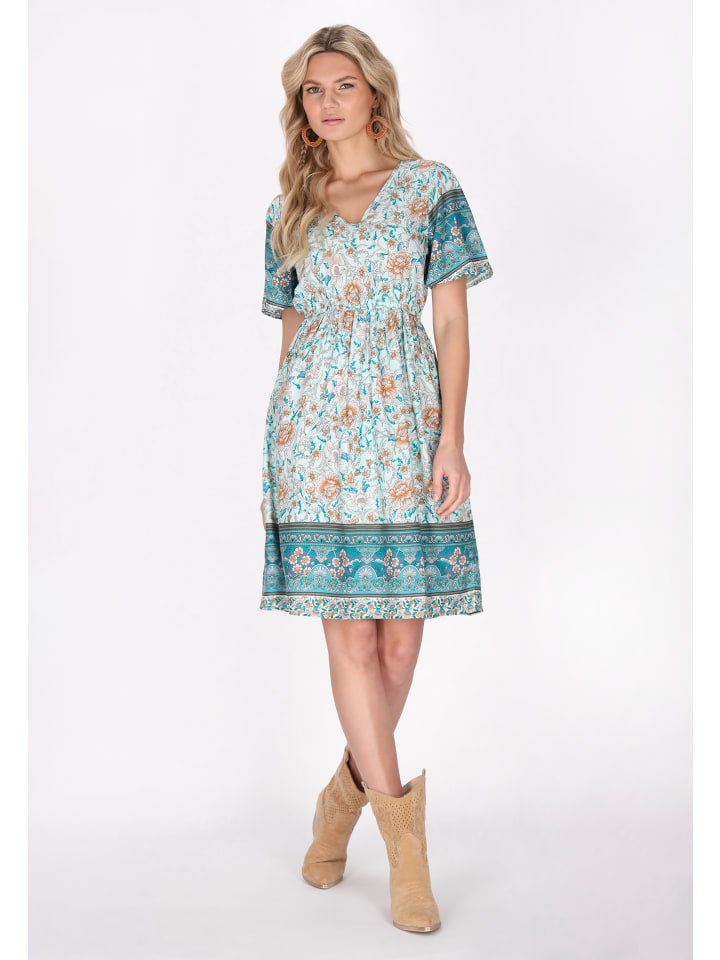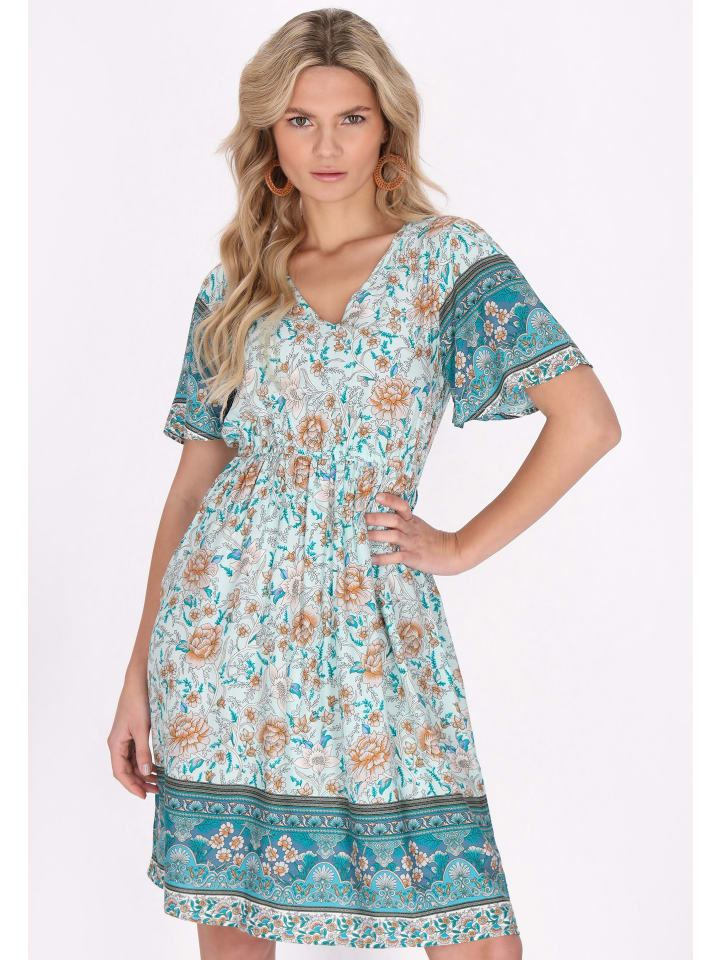 Discover a stunning mini dress from our Boho Fashion Collection. This ethno-inspired piece features a v-neck and short sleeves, perfect for a festival look. The elastic waist ensures a flattering regular fit, while the border detail enhances its style. Made from lightweight viscose, this summer dress showcases a floral print that captures bohemian charm.