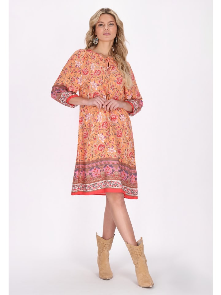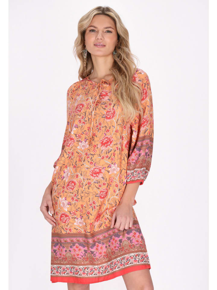 Discover the perfect midi tunic dress from our Boho Fashion collection, designed for a stylish summer. This regular fit dress has 7/8 sleeves with elastic band and fashionable front ties at the round neckline. Featuring a vibrant floral print, the airy silhouette is perfect for any summer festival or as a chic beachfront throw-on.