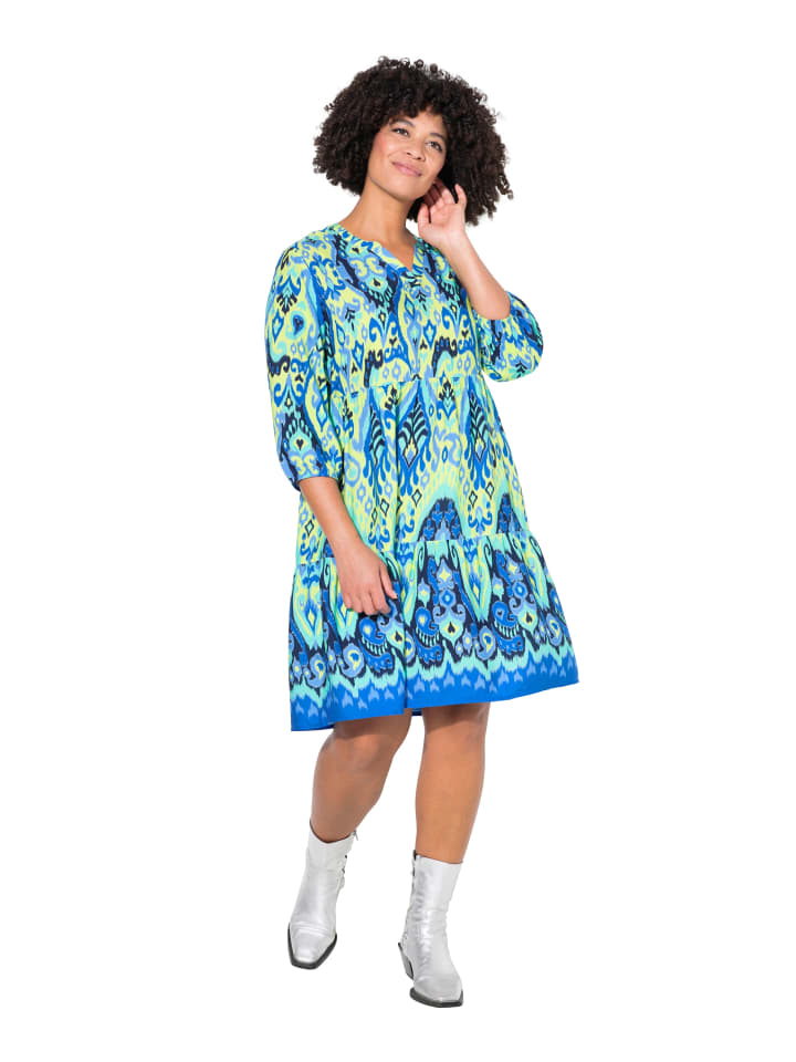 Платье А-силуэта из мягкой вискозы с орнаментальным принтом. Вырез туники, эластичный шов на талии, воланы подола. Рукава 3/4 с эластичной отделкой.материал