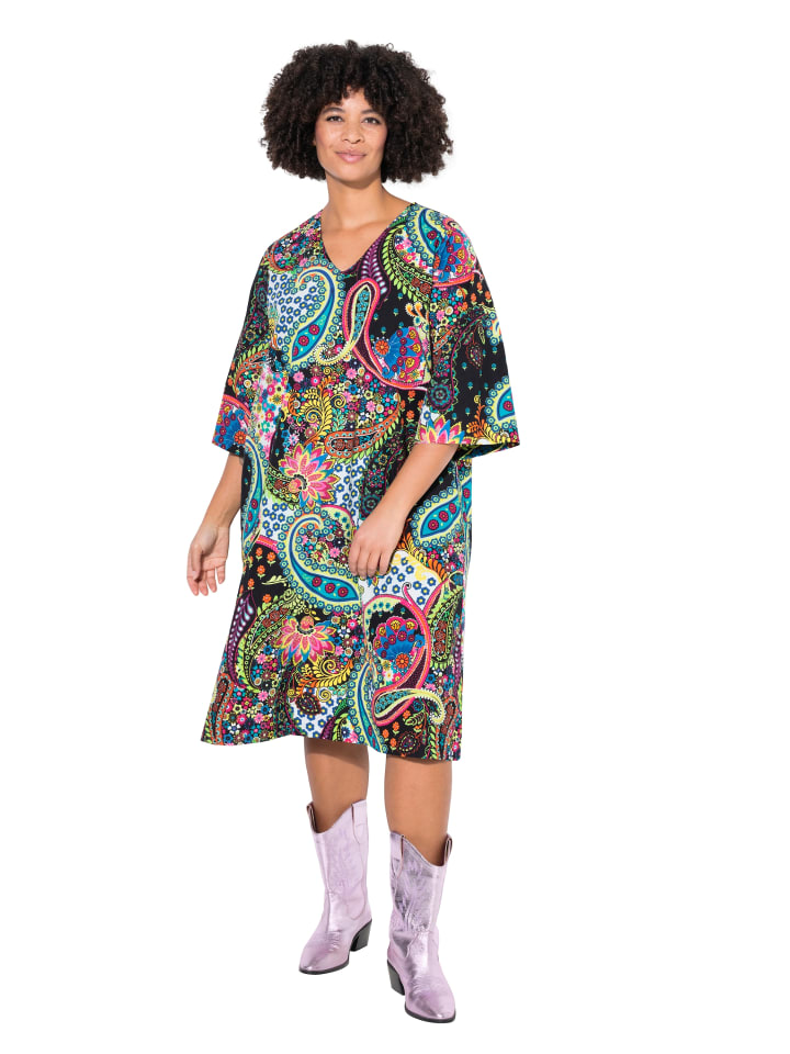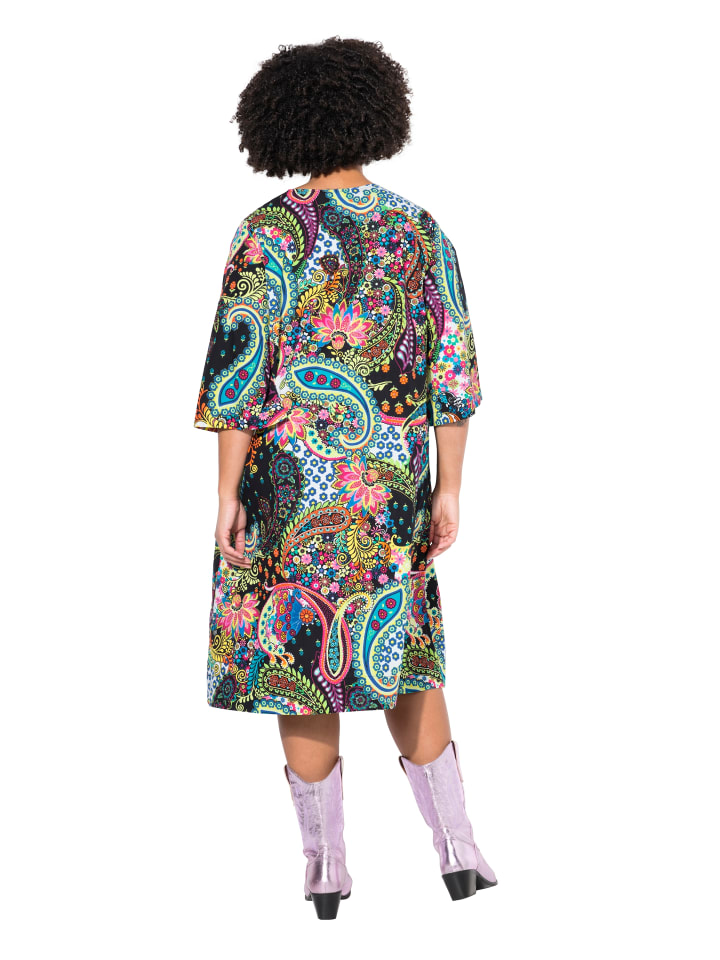 Платье-миди А-силуэта из мягкого поплина с принтом пейсли. V-образный вырез, широкие рукава 3/4, карманы с боковым швом.материал