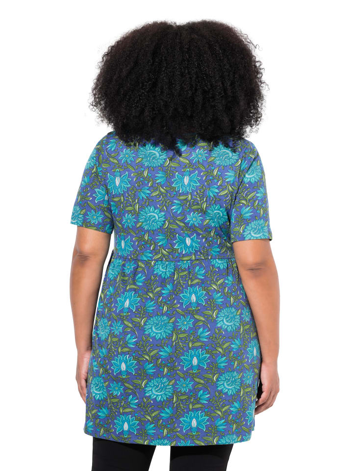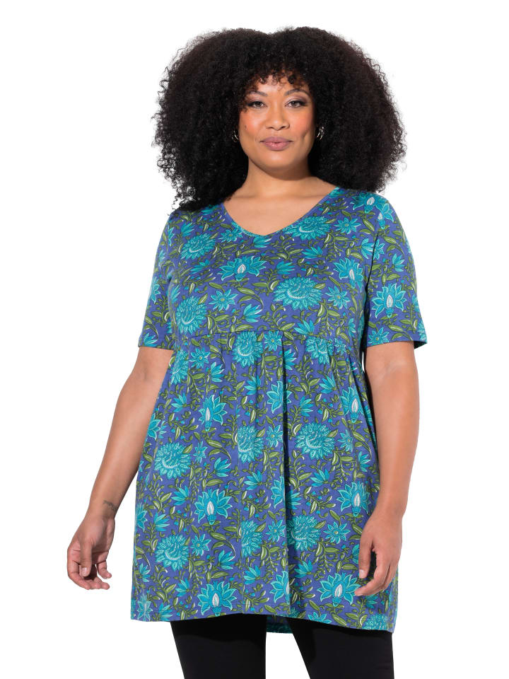 Длинная рубашка, удобного кроя, с цветочным принтом. V-образный вырез, эластичный имперский шов. Карманы с боковым швом, полурукав.материал
