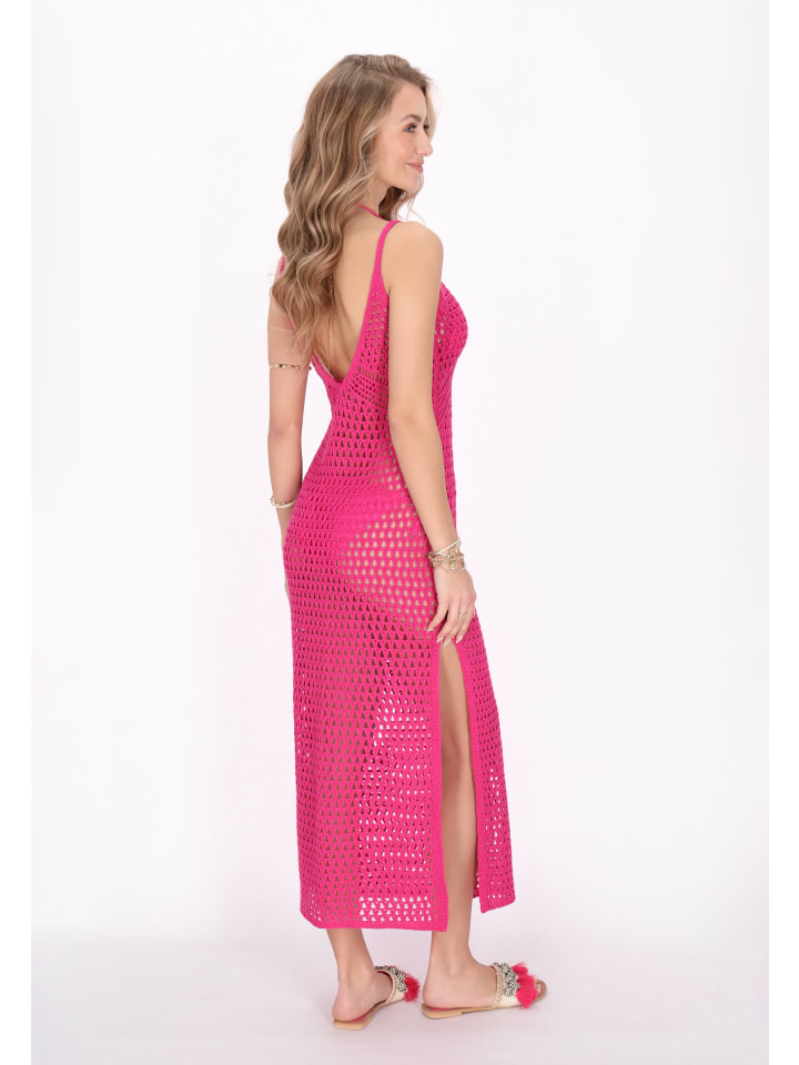 Introducing a stylish, fitted midi dress from our Spring Summer collection. It showcases boho elegance and openwork crochet detailing throughout the dress. The V-neckline and thin straps emphasize the ethnic-inspired style, while floral embellishments at the chest add a playful touch. This sleeveless dress with side slits provides comfort and style, making it perfect for summer occasions.