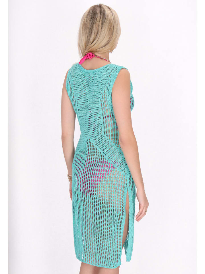 Introducing a slim midi dress with a V neckline and sleeveless is perfect for festival boho styling. The openwork knit pattern provides a stylish and airy look, while side slits add comfort. Ideal as an outer garment or as a throw-on over tailored clothing for a casual look on warm days. This dress is part of the Fashion Look Collection.