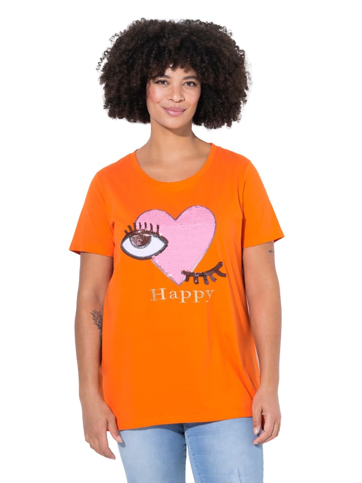 Футболка А-силуэта, с глазами-сердечками, блестками и вышитыми надписями. Круглый вырез, полурукав. Подол сзади длиннее.материал