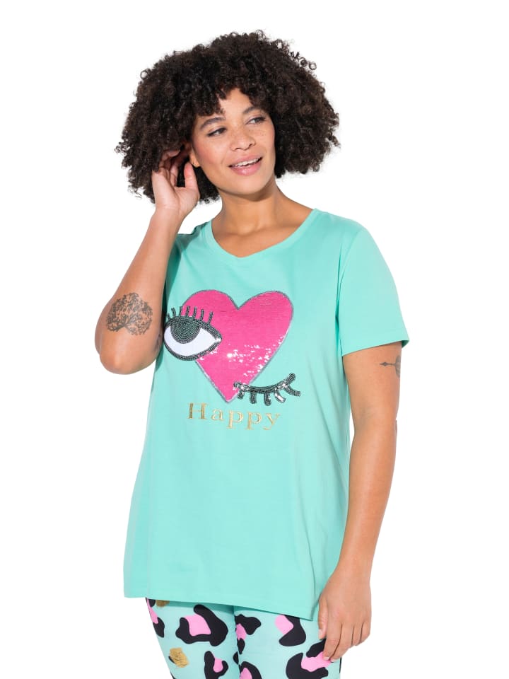 Футболка А-силуэта, с глазами-сердечками, блестками и вышитыми надписями. Круглый вырез, полурукав. Подол сзади длиннее.материал