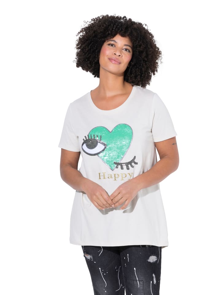 Футболка А-силуэта, с глазами-сердечками, блестками и вышитыми надписями. Круглый вырез, полурукав. Подол сзади длиннее.материал