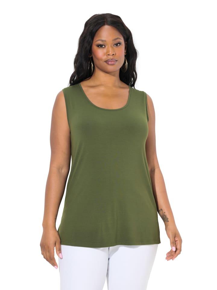 Длина по размеру около 68-76 см.Красивая майка с высоким содержанием вискозы.С круглым вырезом и широкими бретелями.Майка доступна во многих цветах.Улла Попкен – бренд для пышных и модных женщин.материал
