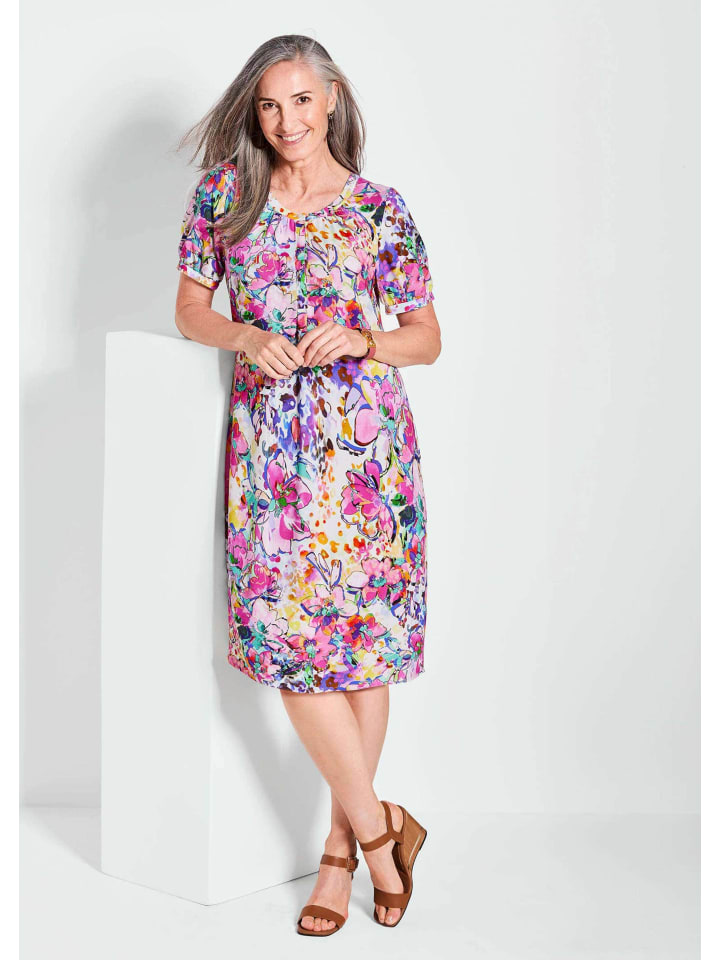 Платье с ярким цветочным узором - залог хорошего настроения на каждый день! Модель в форме маленькой вешалки, облегающей фигуру, удобна и удобна, а мягкая вискоза приятного качества облегает кожу. Завитки на круглом вырезе и скрытая планка на пуговицах, доходящая до талии, придают лифу изысканный вид. Рукав полудлинной длины окаймлен узкой лицевой панелью. Длина около 102 см в корпусе 46, около 96 см в корпусе 23.