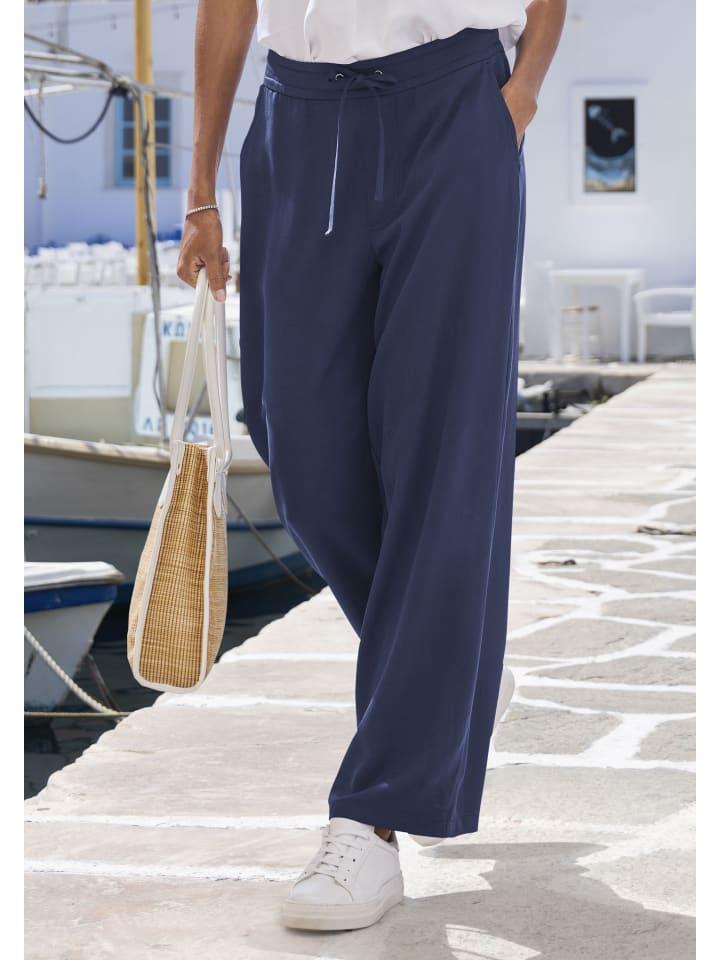 Однотонные брюки-палаццо от Lascana. Пояс с блестящими металлическими проушинами, шнурком и резинкой сзади. Боковые карманы для рук. Легкое качество лиоцелла.