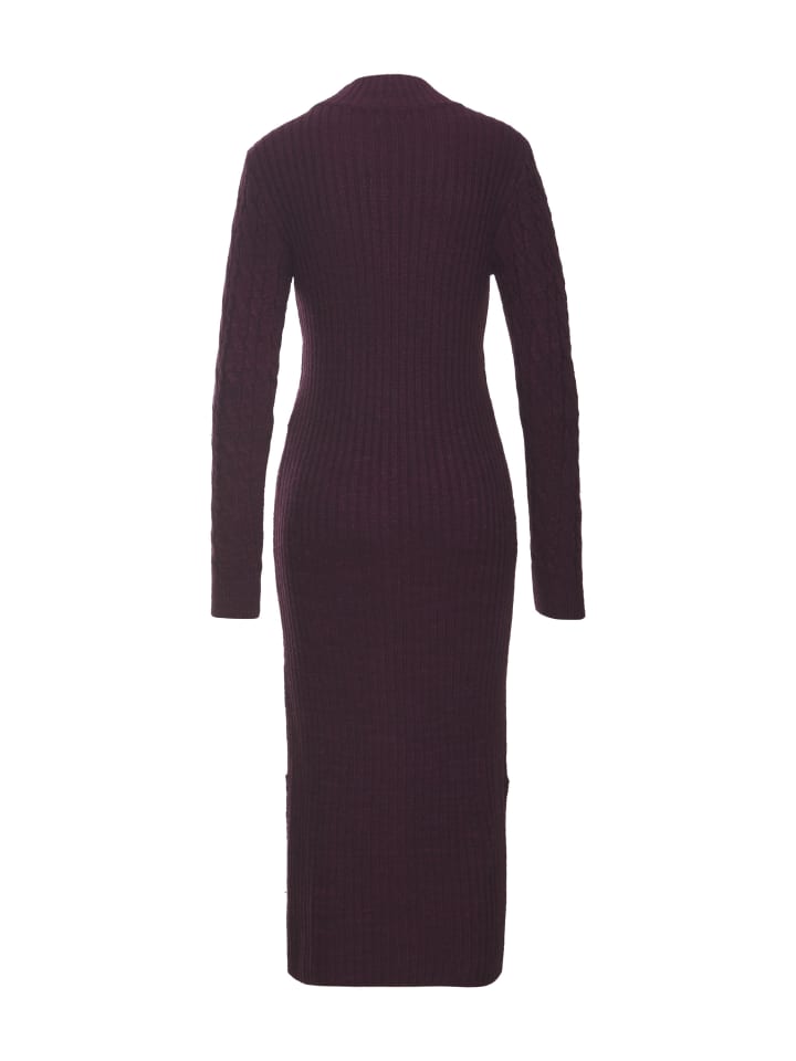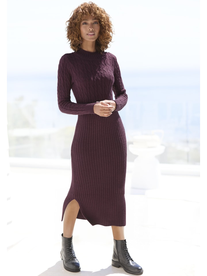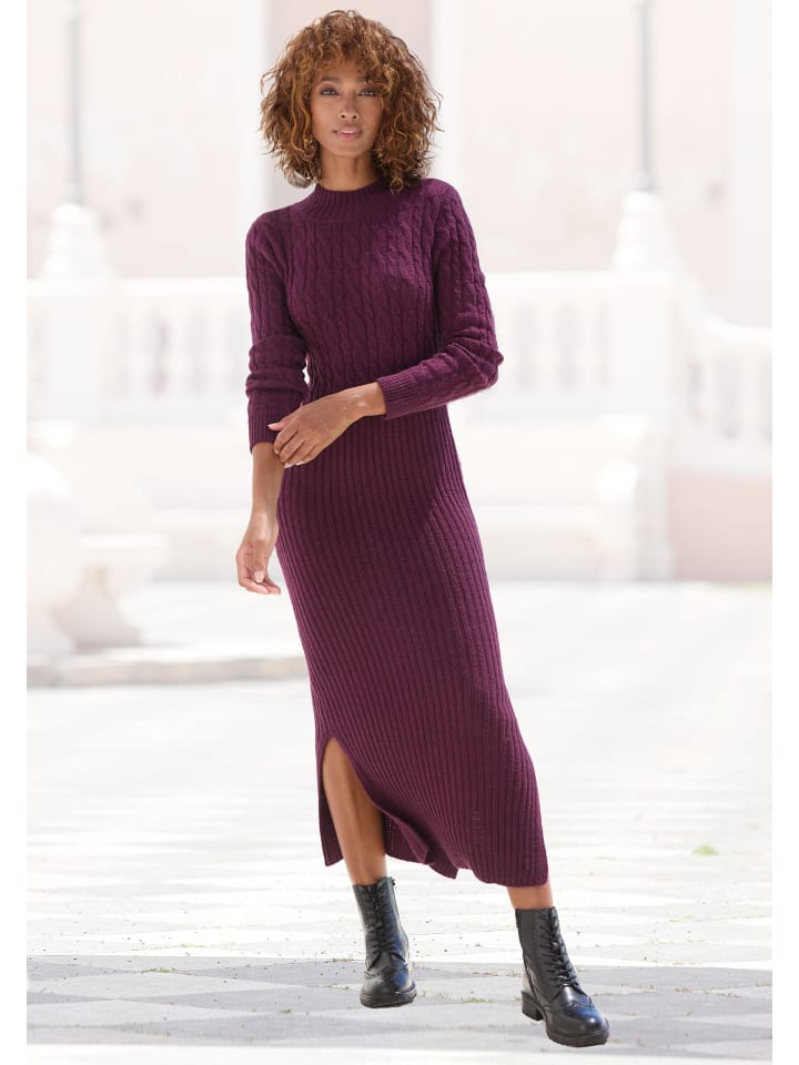Элегантное трикотажное платье от Lascana с частичным плетением косичек. Воротник-стойка. Юбка средней длины с узким вырезом и разрезом по бокам. Вязание легкого ухода с мягким на ощупь качеством.