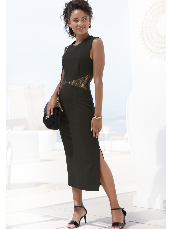 Платье от Lascana с кружевной вставкой в области талии. Круглый вырез с потайной застежкой-молнией сзади. Плотная посадка. Товары без морщин, не требующие особого ухода.