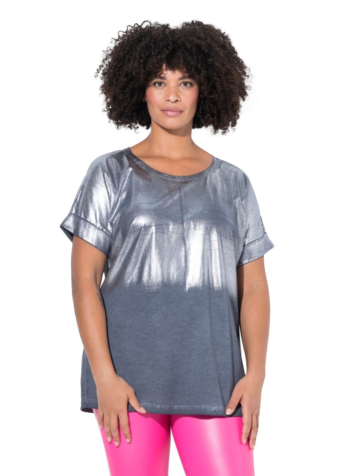 Футболка, удобная посадка, спереди с металлическим градиентом. Модный винтажный образ благодаря кислотной стирке. Круглый вырез, плечи внахлест с оборотом.материалы