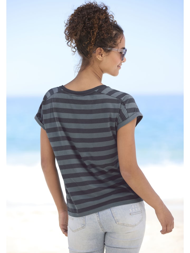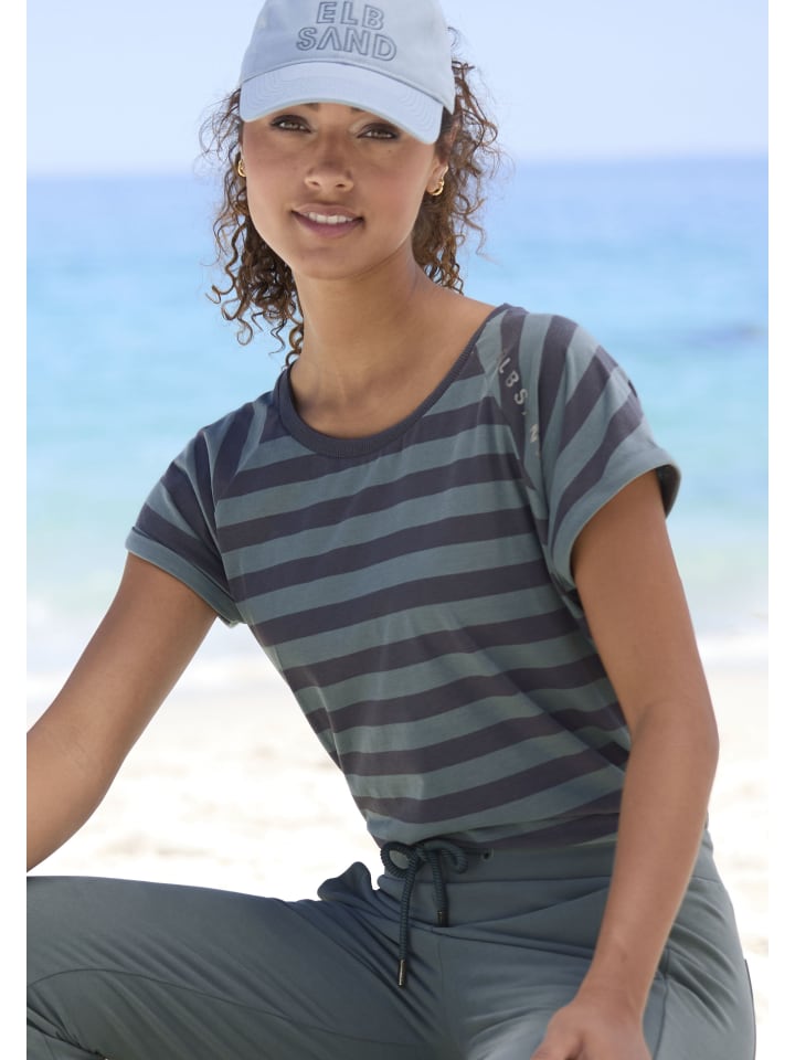 Футболка в тонкую полоску от Elbsand. Далее круглый вырез с однотонной отделкой. Короткие рукава с полями. Печать логотипа по левому шву реглана. Удобная посадка. Трикотажное изделие с мягким покрытием.