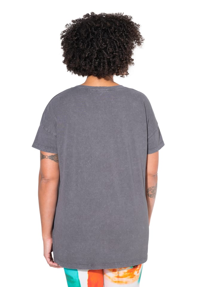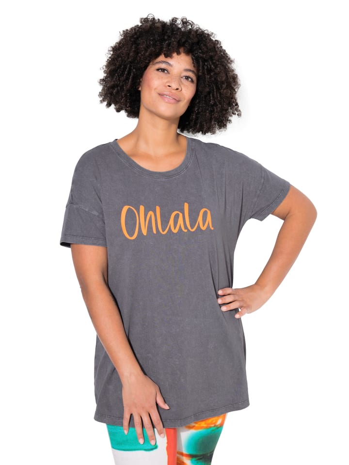 Футболка, удобного кроя, с надписью OHLALA. Винтажный вид благодаря кислотной стирке. Круглый вырез, плечи внахлест, полурукавки.материал