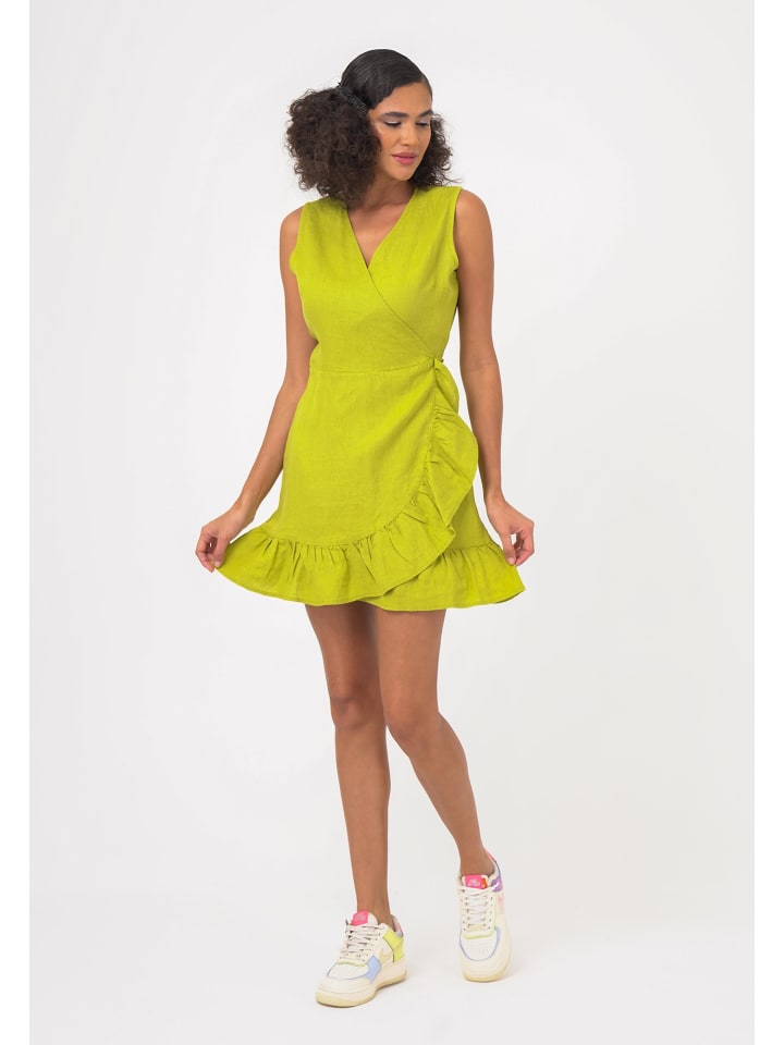 Это элегантное платье с запахом - идеальный выбор для создания стильного, но в то же время комфортного образа. Регулярная посадка и V-образный вырез создают привлекательный силуэт, а оборки придают платью игривый вид. Высококачественный льняной материал обеспечивает комфортное ношение и обладает особой воздухопроницаемостью. Без карманов и рукавов дизайн остается простым и акцентирует внимание на основных деталях. Идеально подходящее для лета и особых случаев, это платье универсально сочетается и является обязательным элементом любого гардероба.