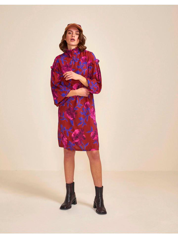 Пионы всегда были одними из наших любимых цветов. Поверх этого удобного платья свободного кроя мы заставим вас сиять еще ярче благодаря блестящей пряжи. На высоком воротнике есть оборки, а пуговицы можно использовать для игривого изменения воротника. Рукава украшены дополнительными оборками чуть ниже плеч. - Вискоза свободного кроя - Изготовлена из португальскихматериалов
