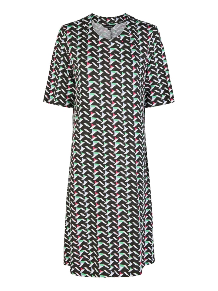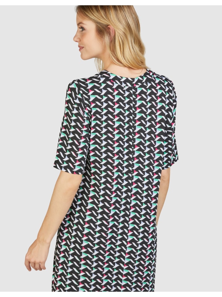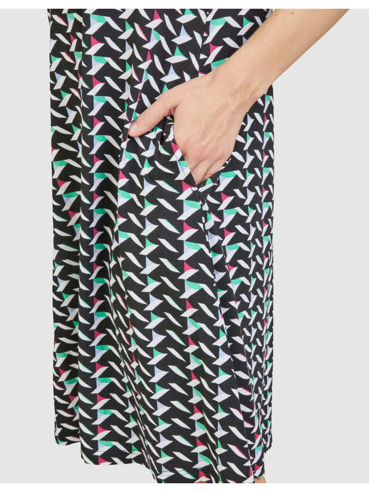 Это красочное женское платье по-настоящему привлекает внимание! С геометрическим принтом в ярких тонах он подчеркивает моду и создает хорошее настроение. Удобный круглый вырез и свободная посадка делают его идеальным для повседневного ношения. Два боковых кармана обеспечивают дополнительный комфорт и придают платью непринужденный вид. Крой до колен и эластичный материал обеспечивают свободу движений, что делает это платье идеальным выбором для теплых дней.
