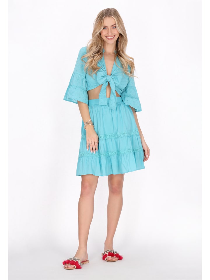 Enrich your closet with this stylish regular cut mini skirt. It exudes boho charm, perfect for a festival collection. With crinkle detailing and lace ribbon accents, this skirt presents an ethno touch. With an elastic waistband, it provides comfort. It is part of the Festival Collection.