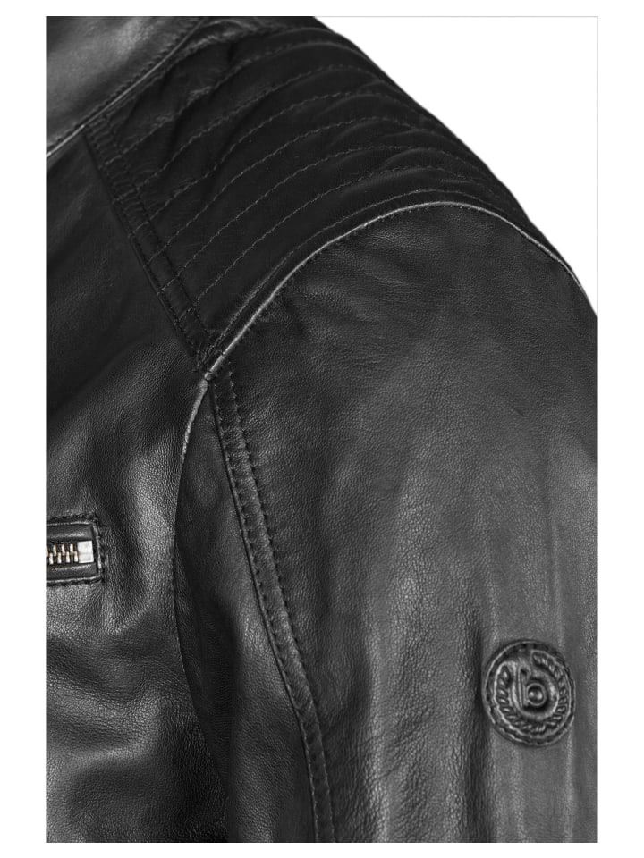 Эта кожаная куртка из натуральной кожи впечатляет высоким качеством изготовления и неподвластной времени элегантностью. Стеганые плечи придают куртке эффектный вид и добавляют модные акценты. Практичные карманы на молнии обеспечивают место для хранения мелких предметов, а воротник-стойка добавляет изделию шика и современности. Рукава на молнии позволяют индивидуально регулировать размер и придают изделию современный вид. Изящная нашивка с логотипом завершает дизайн и создает сдержанное заявление о бренде. Эта кожаная куртка — универсальная вещь, которая одновременно стильная и функциональная. - Модная кожаная куртка с карманами на молнии