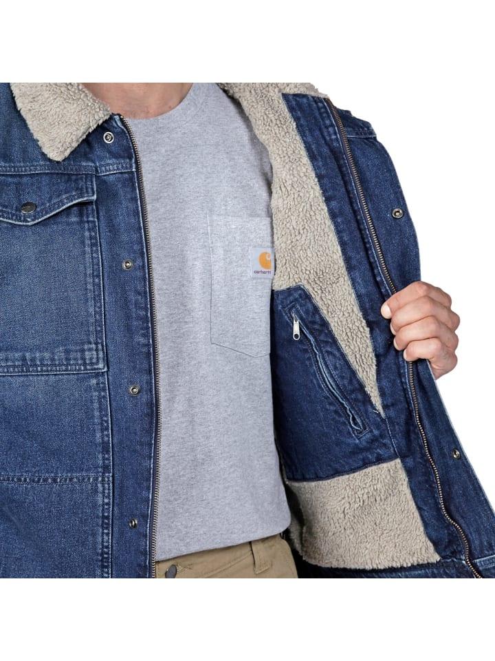 Джинсовая куртка с подкладкой из шерпы. Свободный крой · 12,5 унций/ярд² - 424 г/м² · 100% хлопок · Джинсовая ткань · Подкладка: 100% полиэстер · Подкладка из шерпы для дополнительного тепла · Короткие рукава · Два нагрудных кармана с застежкой на пуговицы · Внутренний карман · Полноразмерная передняя молния с планкой · Удлиненный подол сзади · Тройная прострочка основных швов
