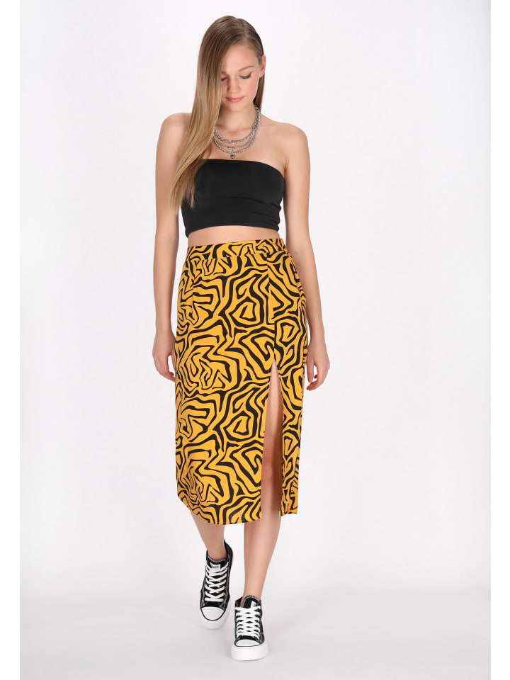 Step into style with this trendy A-Line skirt that features a regular fit and a chic midi length. The high waist design, complemented by a stylish slit, adds an edgy flair to your outfit. Crafted from woven fabric adorned with an eye-catching abstract print, this comfy piece is perfect for everyday fashion and effortlessly embodies rock style vibes. It is a part of the Young Fashion Collection