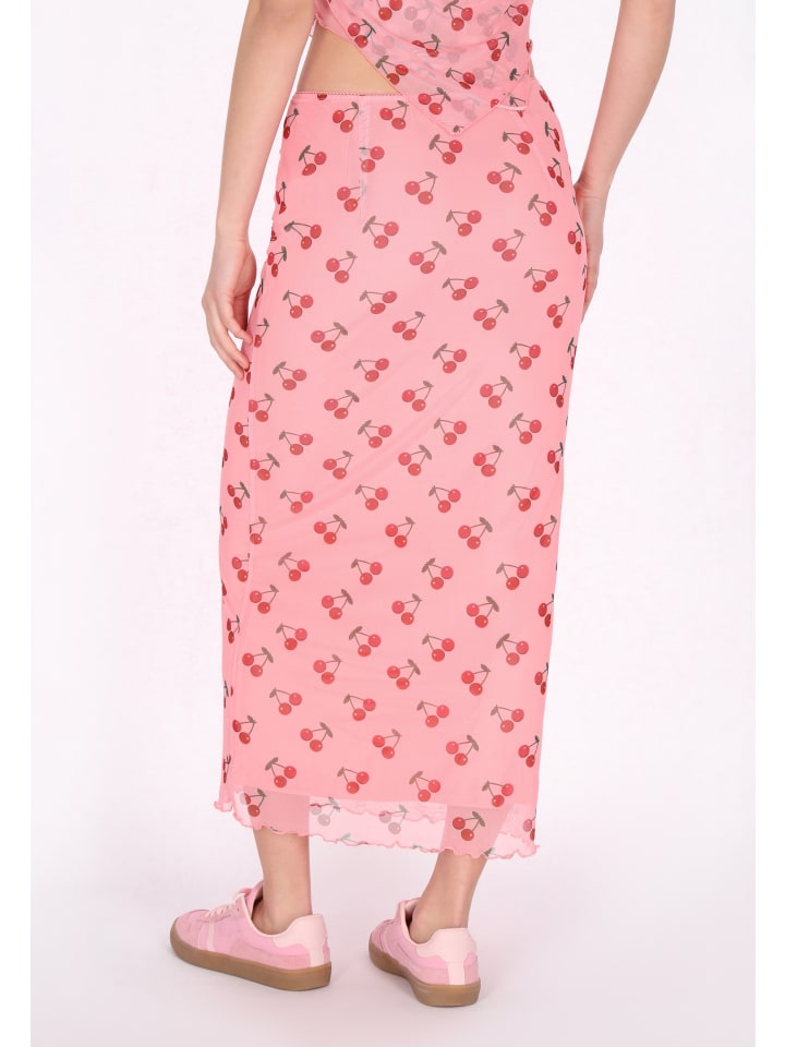 This midi skirt was designed with modern fashion lovers in mind. It presents an elastic waistband for comfort, a fun cherry print that epitomizes young fashion trends. The ruffled hem adds a chic touch, while the mesh lining enhances its appeal. It is part of the Spring-Summer Collection.