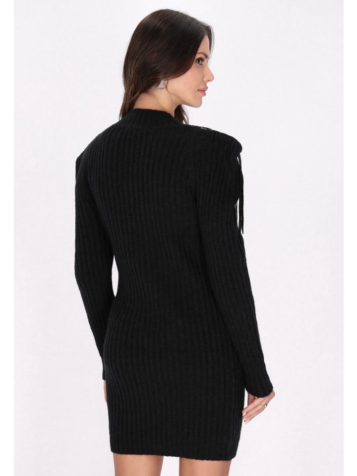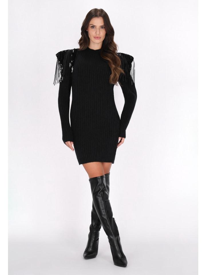 Elevate your style with this elegant mini dress, crafted from knitted fabric. The high neck and long sleeves create a sophisticated silhouette that flatters your figure. Shiny sequins adorn the design, adding a touch of glamour, while fringe details on the shoulders enhance its allure. Идеально подходит для любого случая.материалы