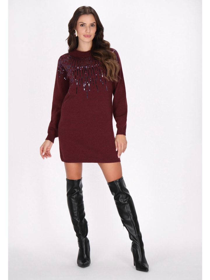 Embrace cozy elegance with this long-sleeves mini dress. Featuring ribbed accents at the round neckline and cuffs, it radiates warmth and style. The straight silhouette falls to mid-thigh, making it versatile for any occasion. Adorned with sequins in a stunning pattern, this knit dress adds glamour while keeping you chic during cooler seasons.materials