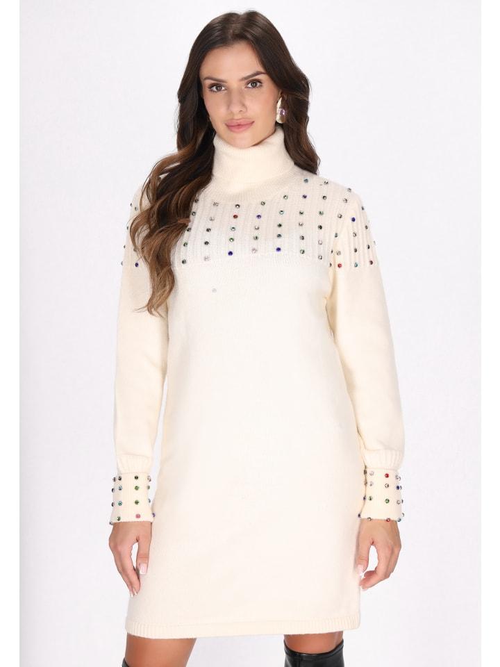 Embrace elegance with this turtleneck sweater mini dress, designed for comfort and style. Featuring long sleeves and ribbed cuffs, it ensures a cozy fit. The mini length is adorned with bling rhinestones that elevate it's knitted texture. Ideal for Christmas or casual outings.materials